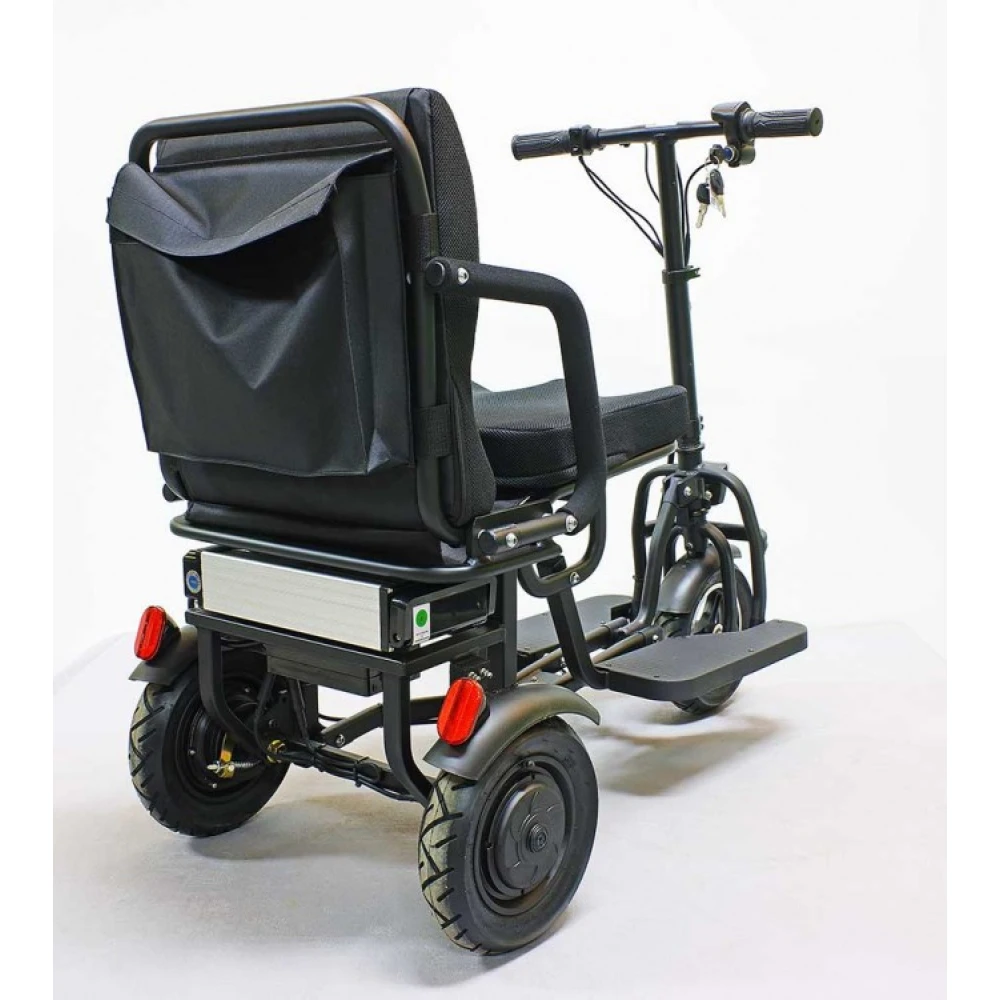 Водительское сидение широкое, имеет специальное воздухопроницаемое покрытие, позволяет длительное время находится в дороге. Техника представлена складной конструкцией, дает возможность легко транспортировать и брать с собой в путешествие. Мощность надежного двигателя 700 Вт позволяет развивать максимальную скорость 25 км/час за короткий период. Заряда емкого аккумулятора достаточно для прохождения 20 км пути без подзаряда. Современная технология изготовления батареи позволяет быстро заряжать, рассчитана на 1000 циклов заряда/разряда.